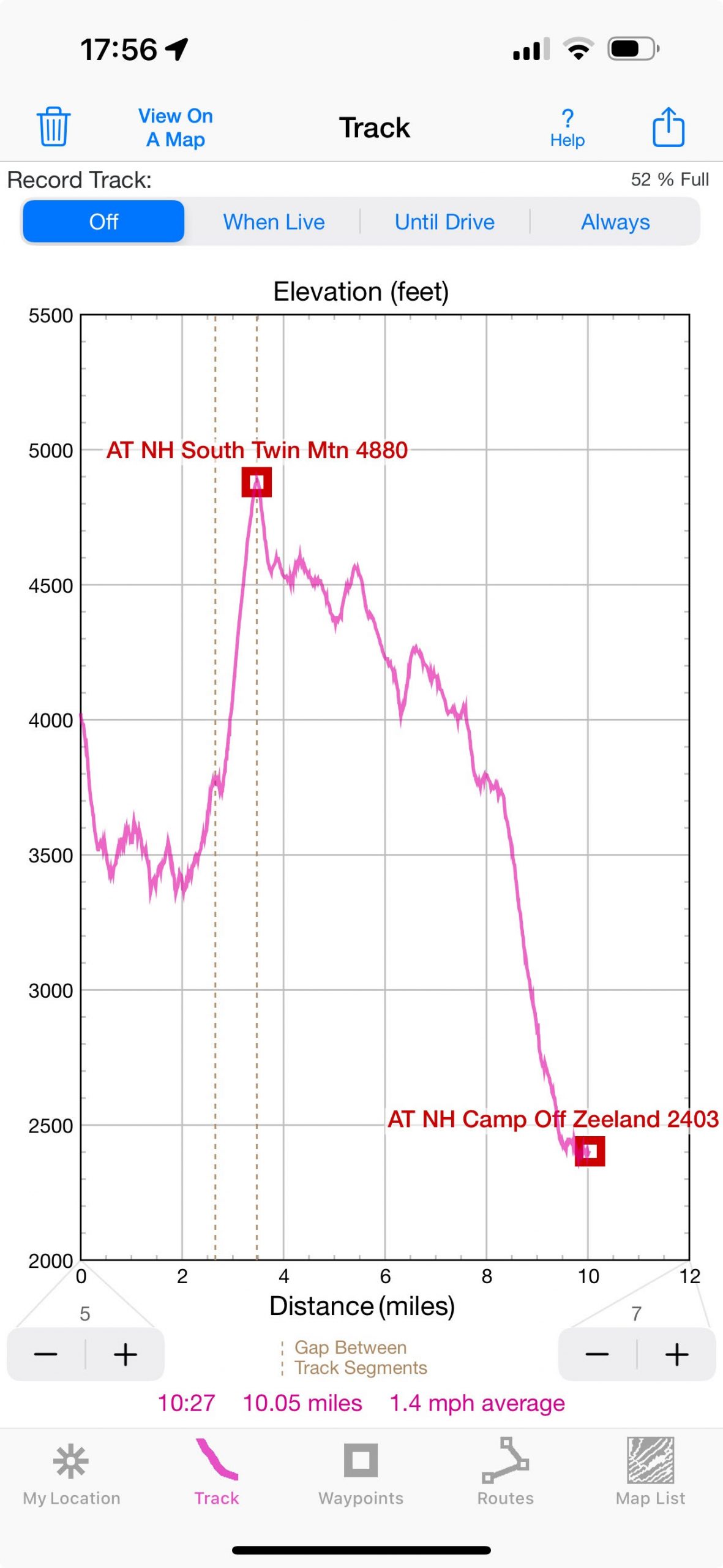 10:56 Hike straight up 0.8 mi climb to South Twin from 3800′ to 4900′