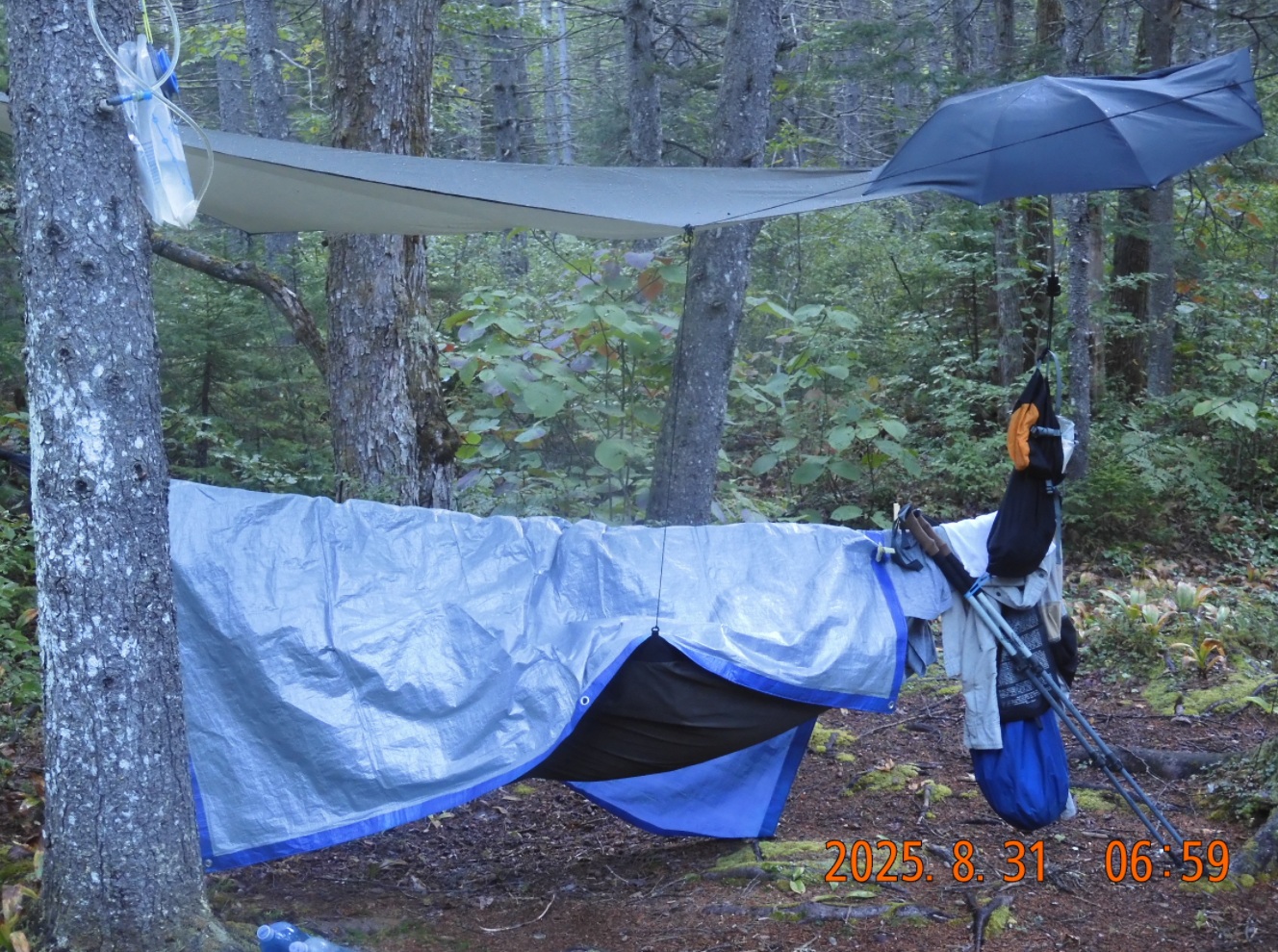 06:49 – It is cold but sunny morning. I climbed out of the hammock 4 times during the night. Rain stopped around midnight, but rain drops continued to pound the rainfly and the tarp. Around 4AM I was getting cold and put on all the clothes. The cold came from somewhere inside, so it was hard to warm up.