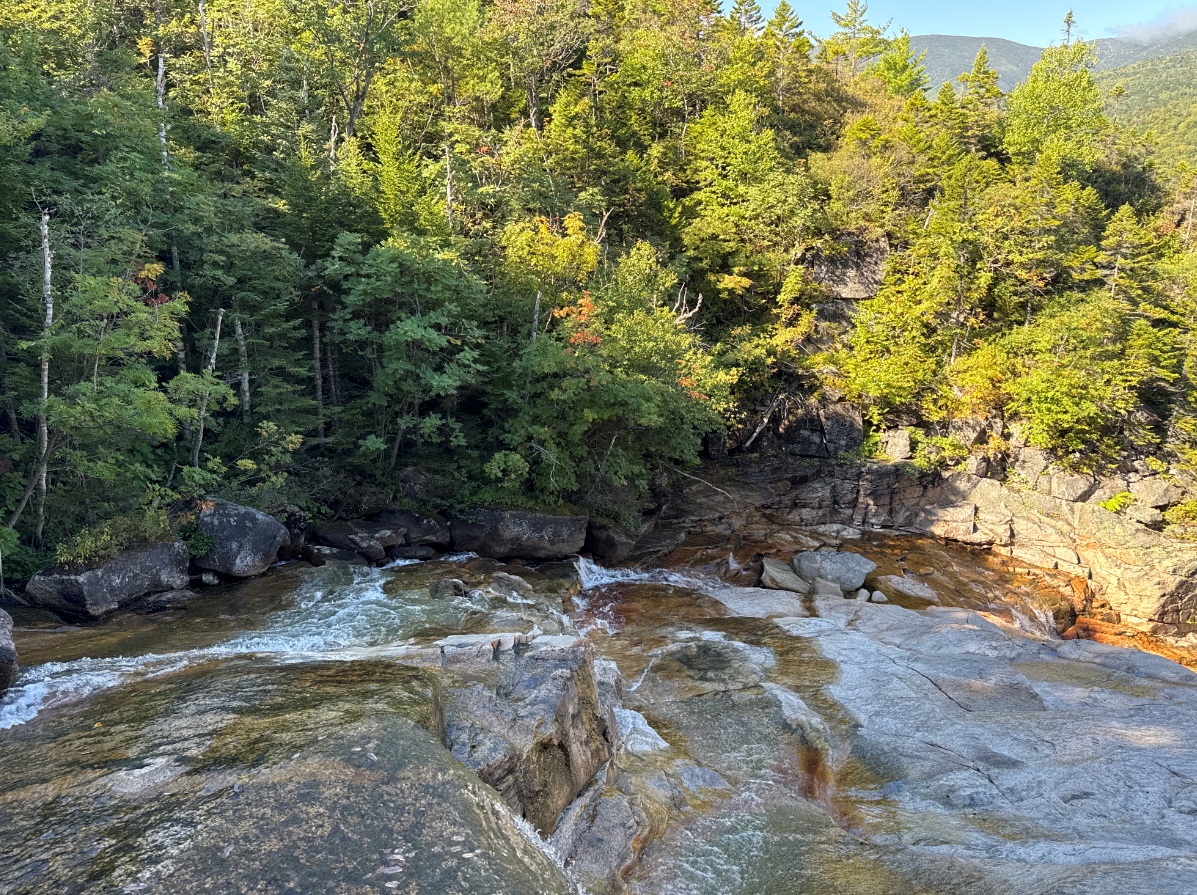 Thoreau Falls are hard to photograph. One can see along the water down the slope. AT is gently imperceptibly sloping up to the Ethan Pond. Fantastic!