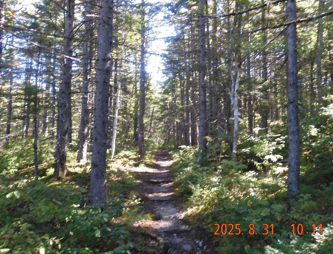 Waking after a comfortable night of rain – everything is good and dry Very flat Ethan Pond trail goes along the edge – a big difference from yesterday