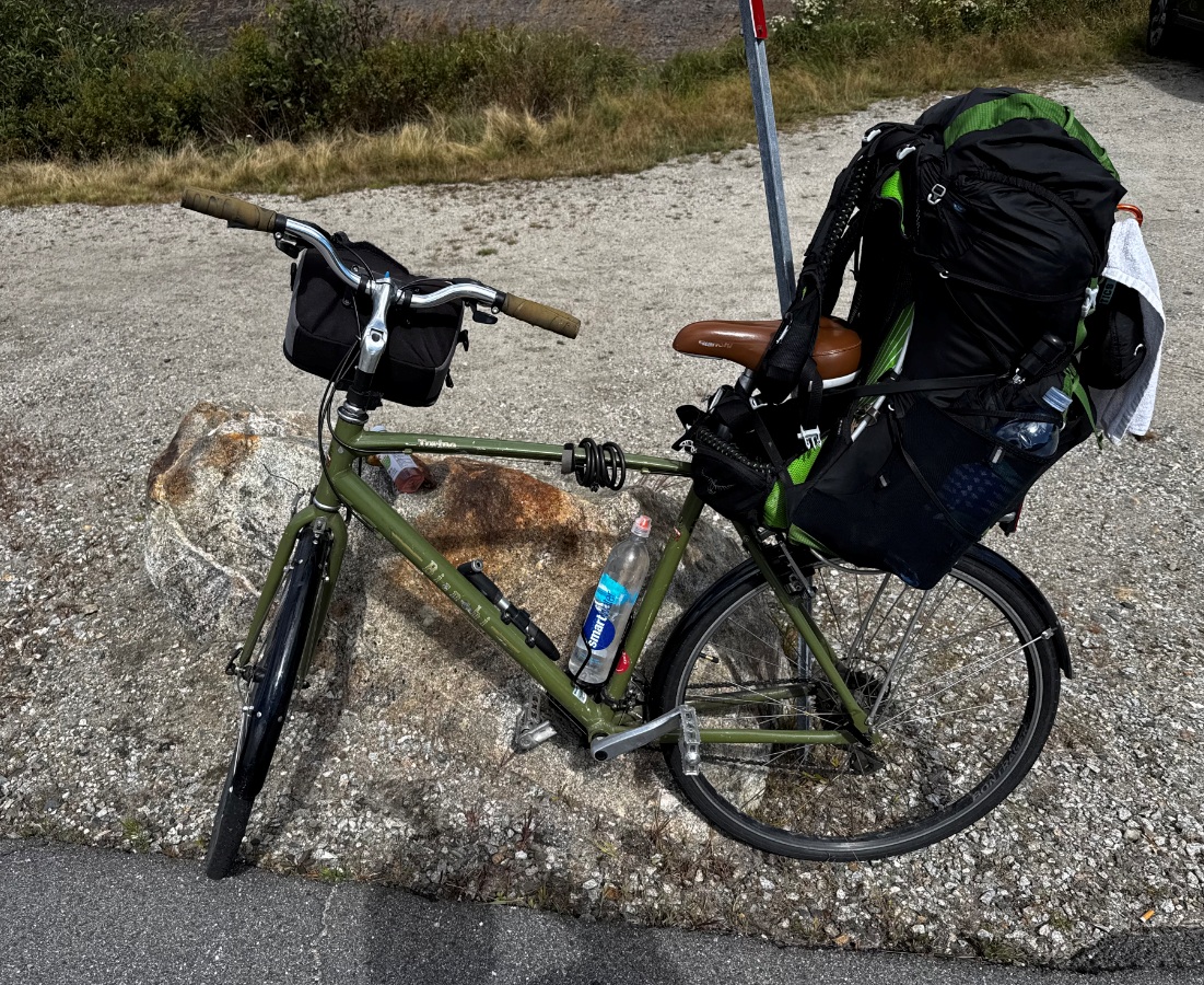 Bike is loaded and ready to go. 28 mi to go. 11 easy miles completed.  16 more difficult miles to go. Very steep hill ahead ?