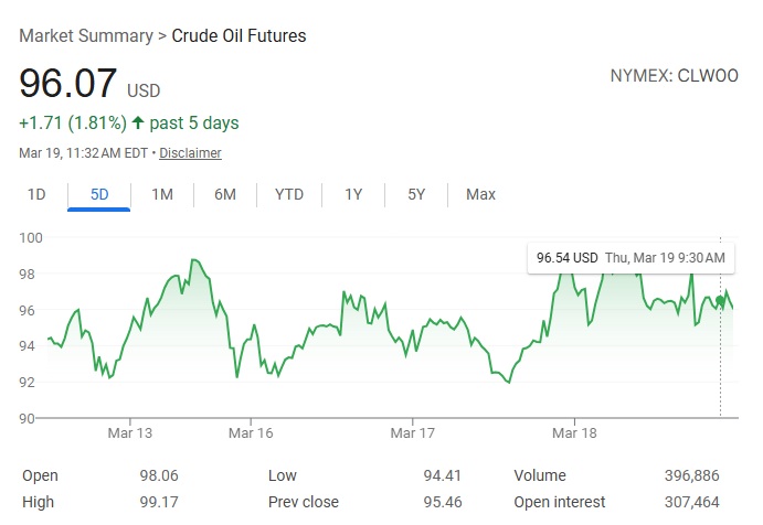 Последние 5 дней (март 13-19) цены на нефть держаться стабильно вокруг $92-98 за баррель: