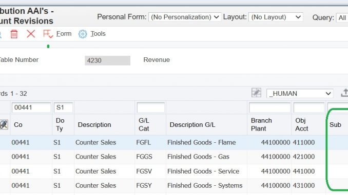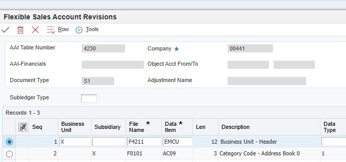 Next, you set up your flex accounting rules using P40296 by Co, by AAI and by desired portion of the account (BU, Sub, range of OBJ accounts).