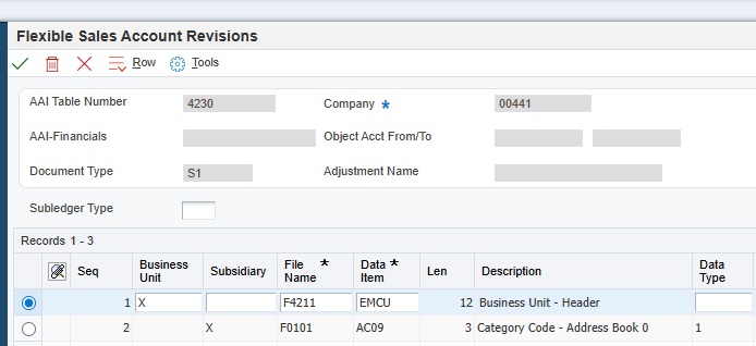 Next, you set up your flex accounting rules using P40296 by Co, by AAI and by desired portion of the account (BU, Sub, range of OBJ accounts).
