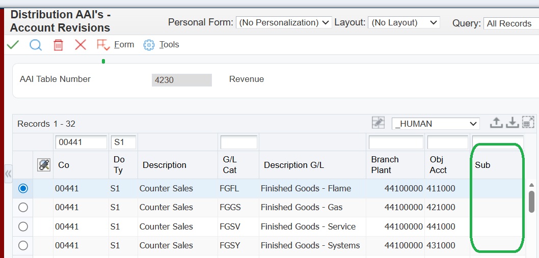 First, you define your P40950 AAI Sales AAI with blank Sub (Subsidiaries).